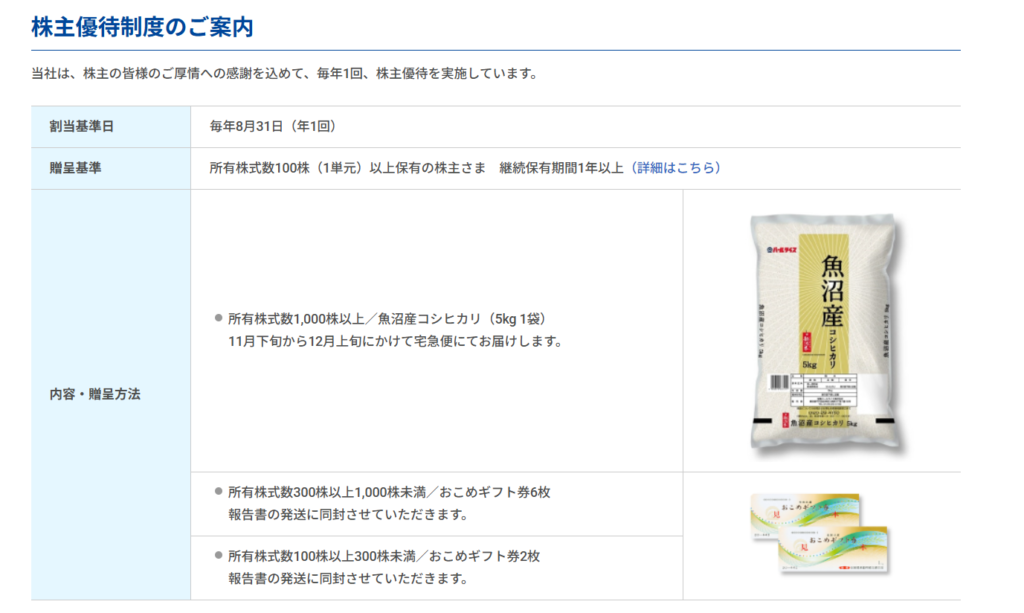 優待○:お米系で実用的(ただし利回りは小さい)