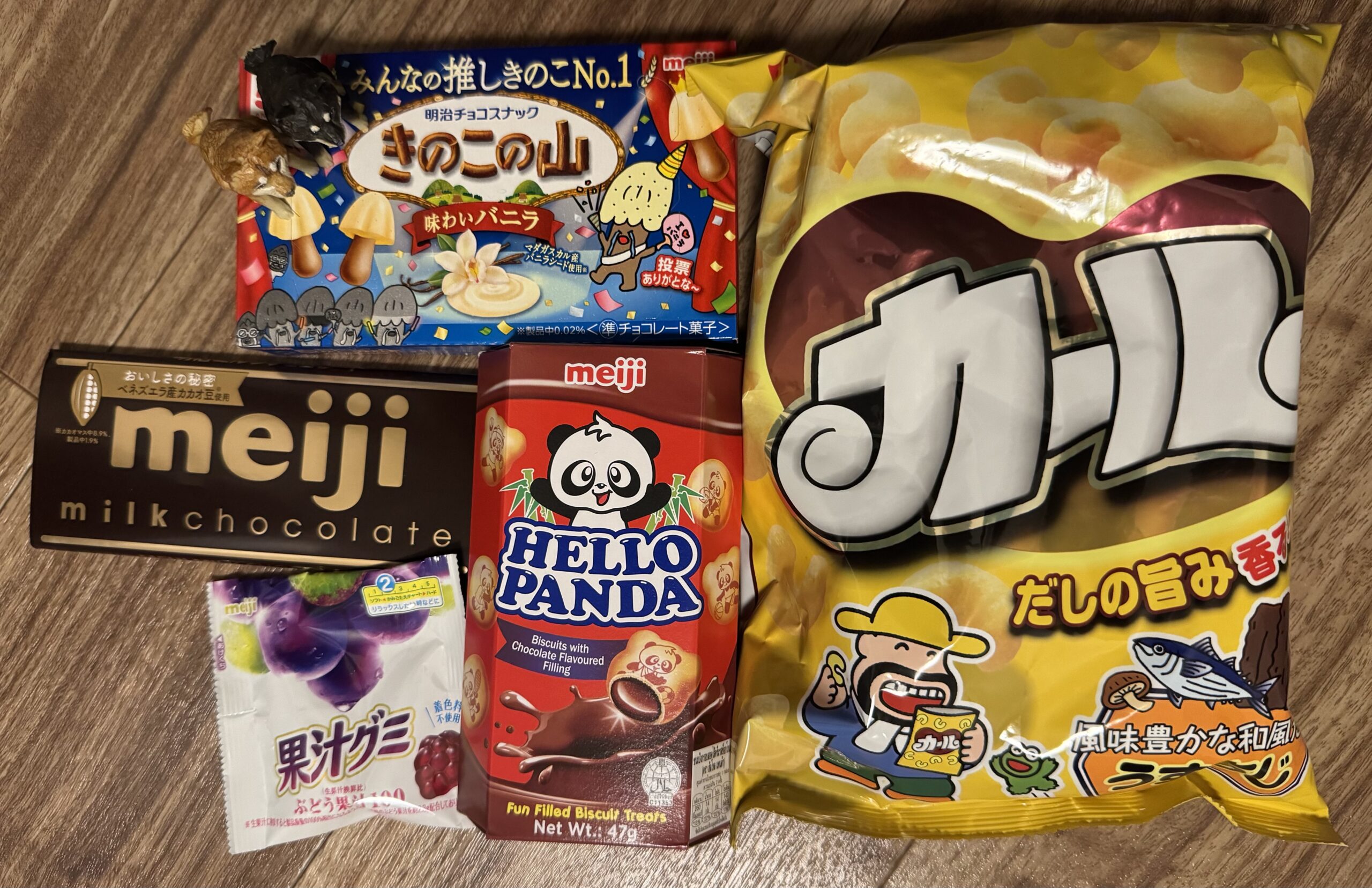 中を開封すると↓の様な中身となっていました。私は関東住みなので、カールが手に入らないので食べる前からワクワクしています!Hello Pandaという商品は初めて見ましたが、明治シンガポールで製造された商品を逆輸入しているみたいです。株主を楽しませる為の工夫が多く素敵な優待品です。