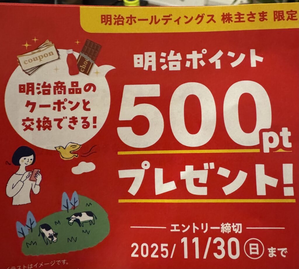 さらには株主限定で明治商品と交換できる500ptが付与されるとのこと。何と交換できるかわかりませんが、またわかり次第ご紹介できればと思います。