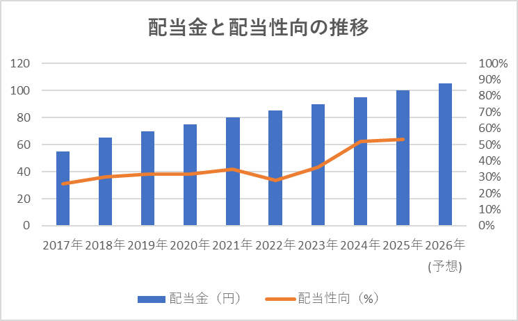 | 将来の総合利回り増加期待度 | ★★★★☆ | 配当推移:過去10年非減配。 配当性向:30-50%程度と健全な水準。 ※以下表参照 |