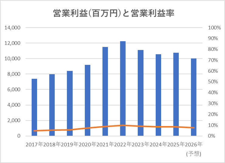 営業利益:長期的には増加傾向。